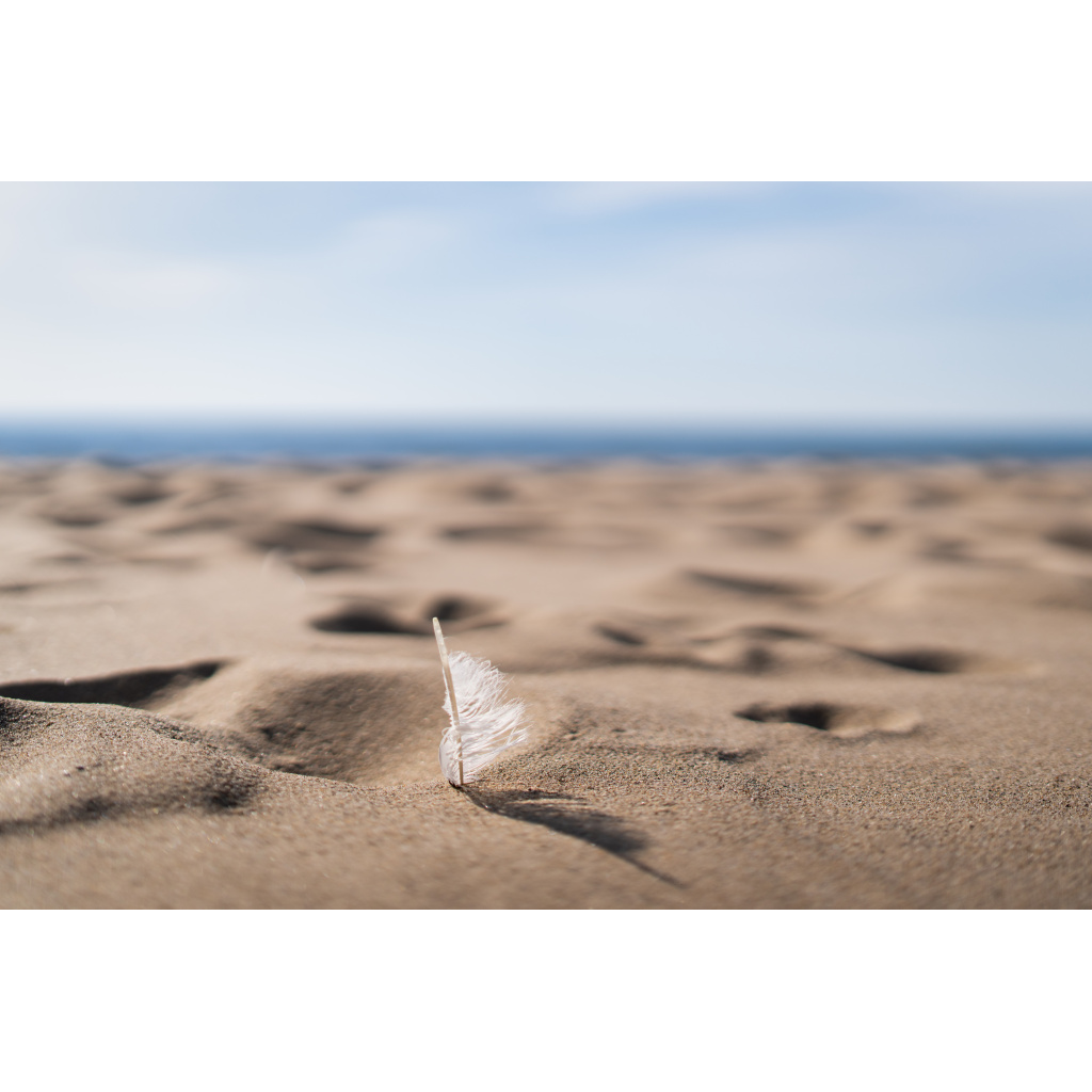 A single delicate feather rests on the sandy shore, captured in soft, natural light that highlights every subtle curve and detail. The textured grains of the beach beneath create a gentle contrast, grounding the feather while evoking the calm rhythm of the shoreline. This fine art piece blends intricate natural detail with serene composition, making it ideal for a living room, office, or any space seeking quiet beauty and connection to nature.