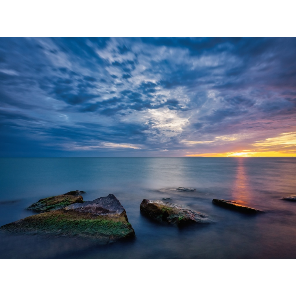 Experience the quiet power of Michigan’s lakeshore with this fine art print from Ludington. Sculpted rocks in the foreground catch the evening light as waves of Lake Michigan swirl gently around their base. The scene radiates raw natural texture and subtle motion — perfect for adding both grounding strength and calm flow to your space.